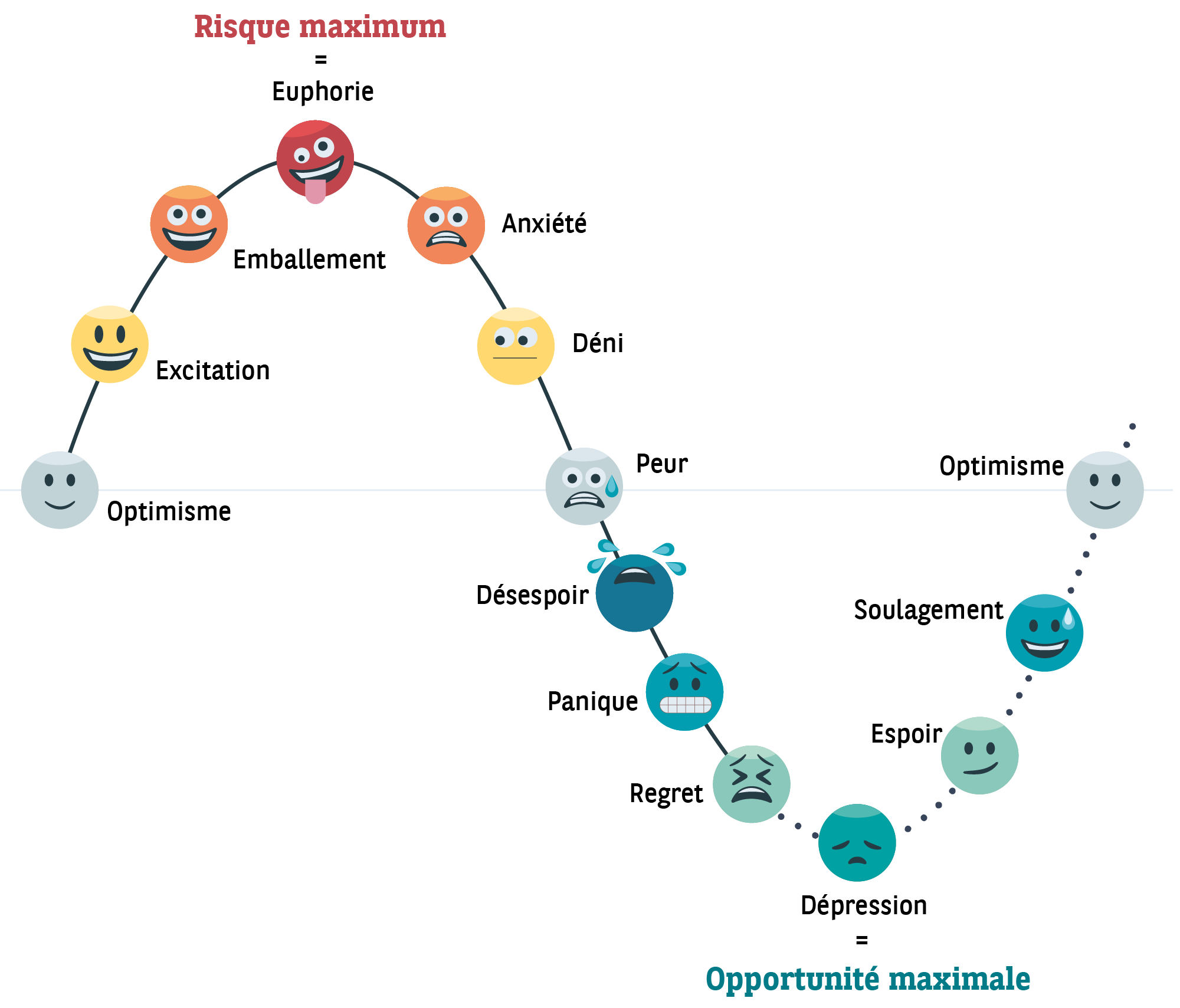 La volatilité des marchés mondiaux est normale et il est important de ne pas perdre de vue ses objectifs d’investissement à long terme et de ne pas modifier sa stratégie en fonction des fluctuations inévitables à court terme. Au lieu de paniquer et de vendre lorsque les marchés ralentissent, les investisseurs devraient au contraire profiter de certaines de ces occasions pour acheter à des conditions très favorables. L’illustration ci-dessous montre comment les émotions des investisseurs peuvent changer selon le moment du cycle de risque financier et comment cela peut présenter des opportunités à mesure que les marchés se rétablissent.