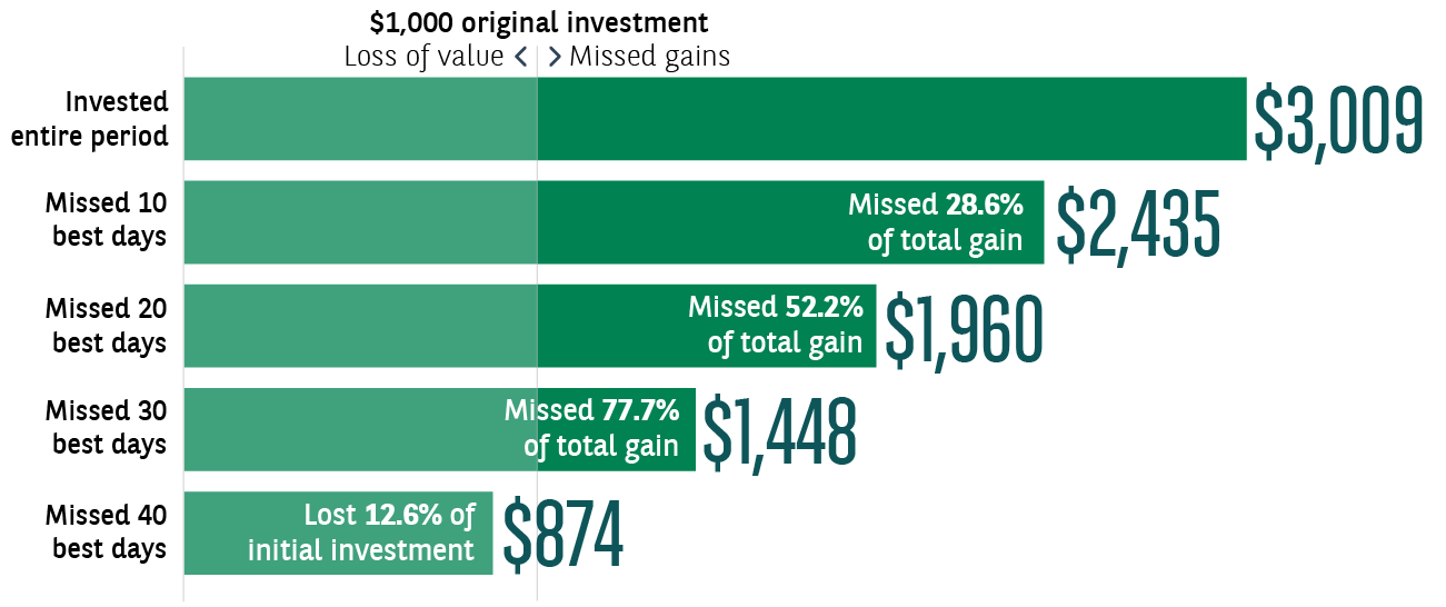 Le graphique ci‑dessus illustre l’écart entre les investisseurs du MSCI All Country World Index (ACWI) restés pleinement investis au cours de la dernière décennie et ceux qui ne l’ont pas été. Il renforce l’idée qu’il est généralement préférable de rester investi : manquer seulement quelques‑unes des meilleures séances peut peser lourdement sur la performance finale. Or, nombre de ces meilleures journées se sont produites à proximité des pires ; vendre lorsque les cours sont faibles augmente donc le risque de rater le rebond lors de la reprise.