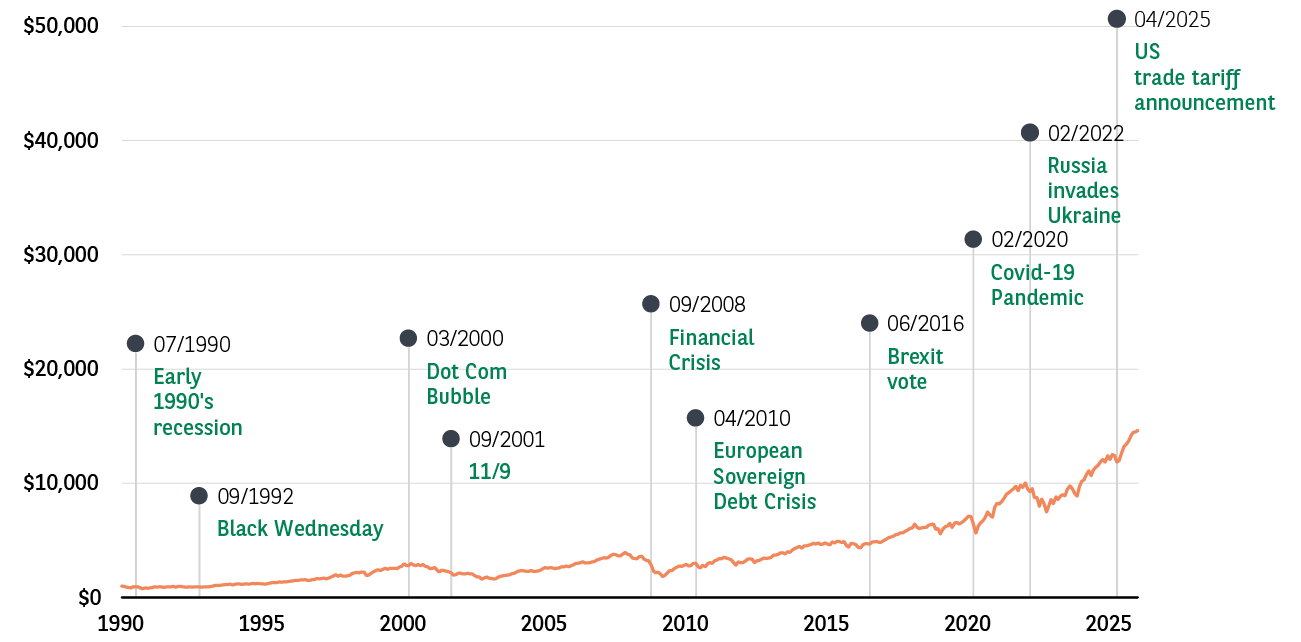 Comme le montre le graphique ci‑dessous, les trois dernières décennies ont été marquées par de nombreux épisodes de volatilité. La période a connu son lot d’événements majeurs capables de faire bouger les marchés. Pourtant, le marché a aussi démontré une forte capacité de rebond et de progression, souvent assez rapidement.