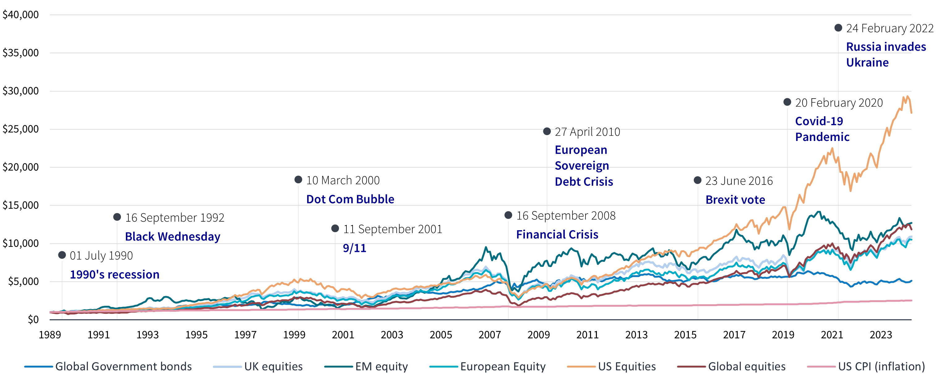 Au fil des années, de nombreux événements ont considérablement influencé les marchés financiers, du mercredi noir en 1992 à la pandémie de Covid en 2020. Malgré ces événements majeurs, les performances à long terme des marchés tendent à rester positives, comme le montre le graphique.