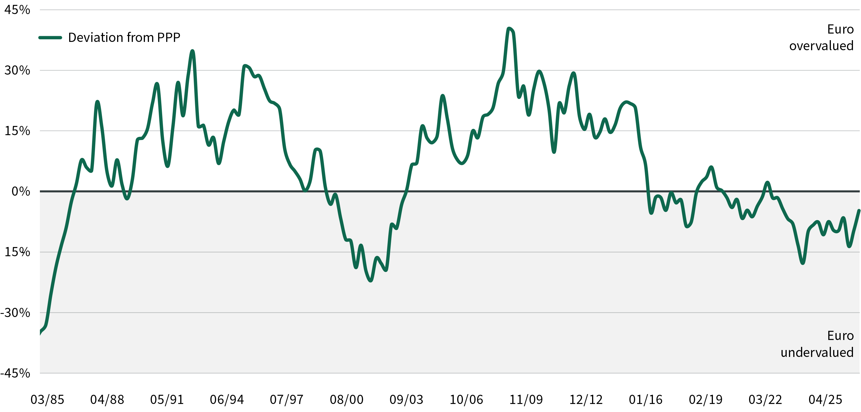 EUR/USD comparé à sa parité de pouvoir d'achat, une mesure de valorisation à long terme