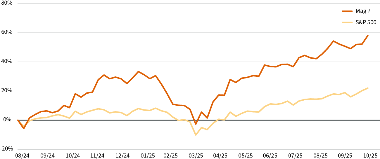 Source: AXA IM Select, Bloomberg, 29 octobre 2025. Magnificent 7: Alphabet, Amazon, Apple, Meta, Microsoft, Nvidia, Tesla